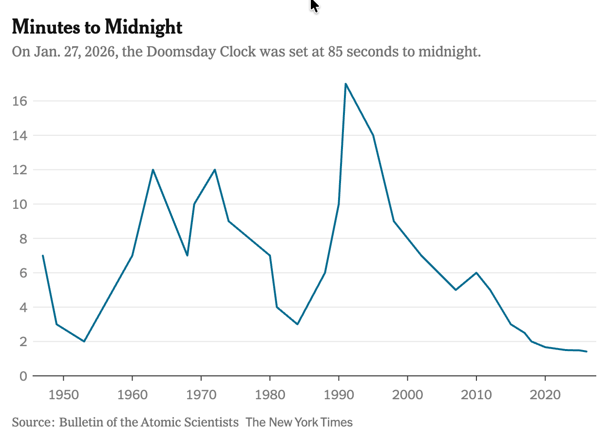 The Doomsday Clock was invented by Einstein, Oppenheimer and friends during the early atomic era to convey to the general public how close we were to annihilation without radical intervention. Today it is stewarded by a collective of scientists, many Nobel laureates. Every January the time is updated. In 2026 the clock was moved four seconds closer to midnight. It’s now 85 seconds to midnight, the closest we’ve ever been to self-annihilation by a wide margin. Even at the height of the cold war, the clock only ever made it to 2 minutes to midnight. In 2025 when they advanced the clock to 89 seconds, their joint statement was unequivocal: “the world is on a course of unprecedented risk, and that continuing on the current path is a form of madness.” Noose, indeed.